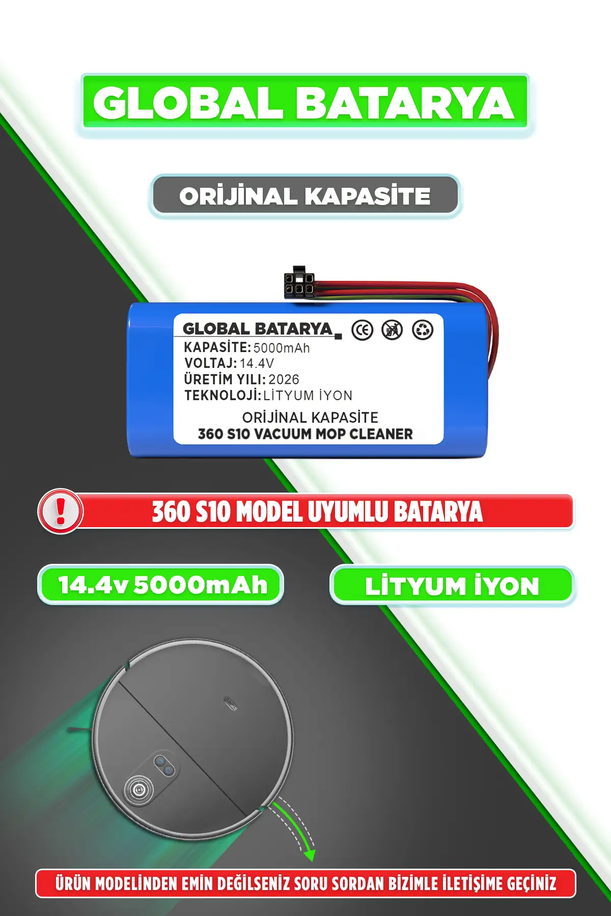 360 S10 Vacuum Mop Cleaner Batarya, robot süpürgenizin fabrika çıkış performansına yeniden kavuşmasını sağlayan orijinal kapasiteli (5000mAh) yedek bataryadır. Eski bataryanızın ömrü azaldığında, bu orijinal kapasiteli batarya ile süpürgeniz ilk günkü temizlik süresi ve verimliliğine döner.