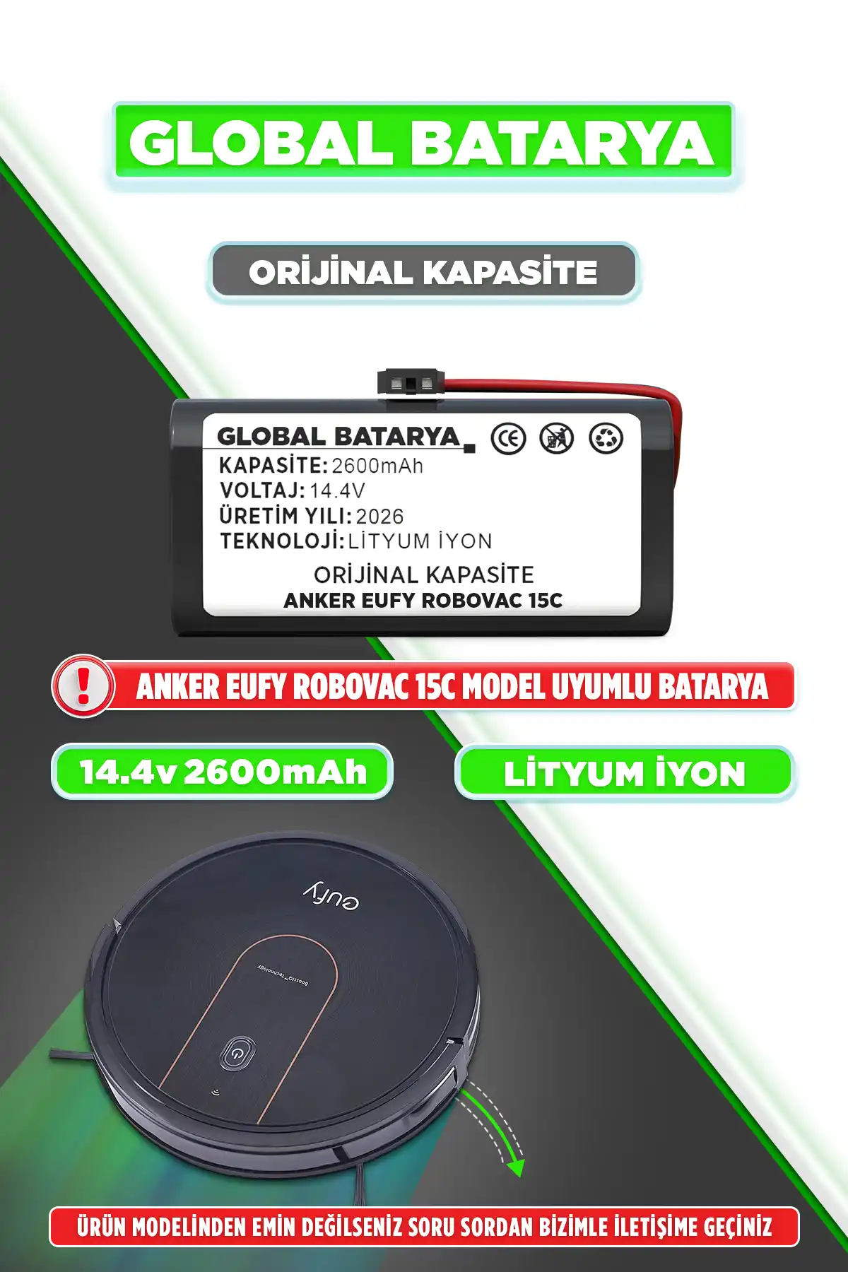 Verimli Performans: 2600mAh orijinal kapasite, robot süpürgenizin orta büyüklükteki alanları etkili bir şekilde temizlemesini sağlar.