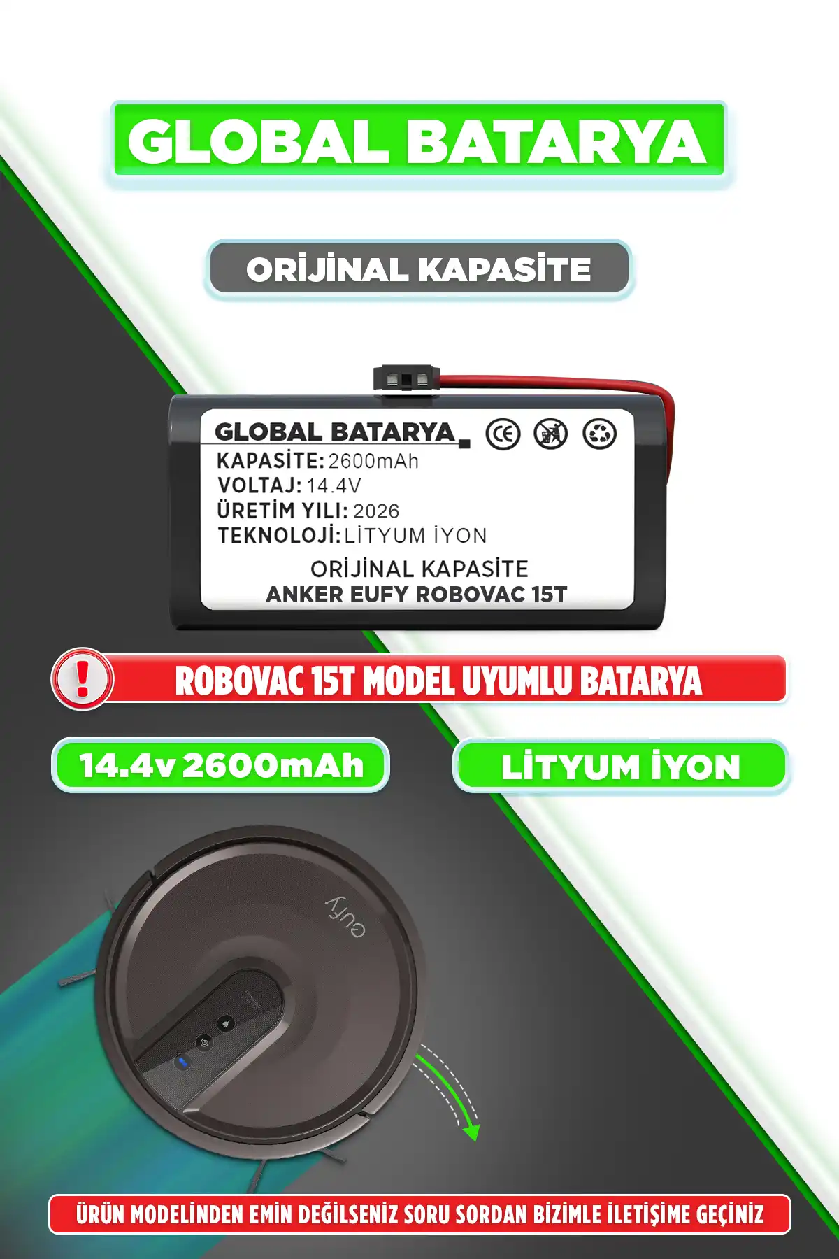 Verimli Performans: 2600mAh orijinal kapasite, robot süpürgenizin orta büyüklükteki alanları etkili bir şekilde temizlemesini sağlar.