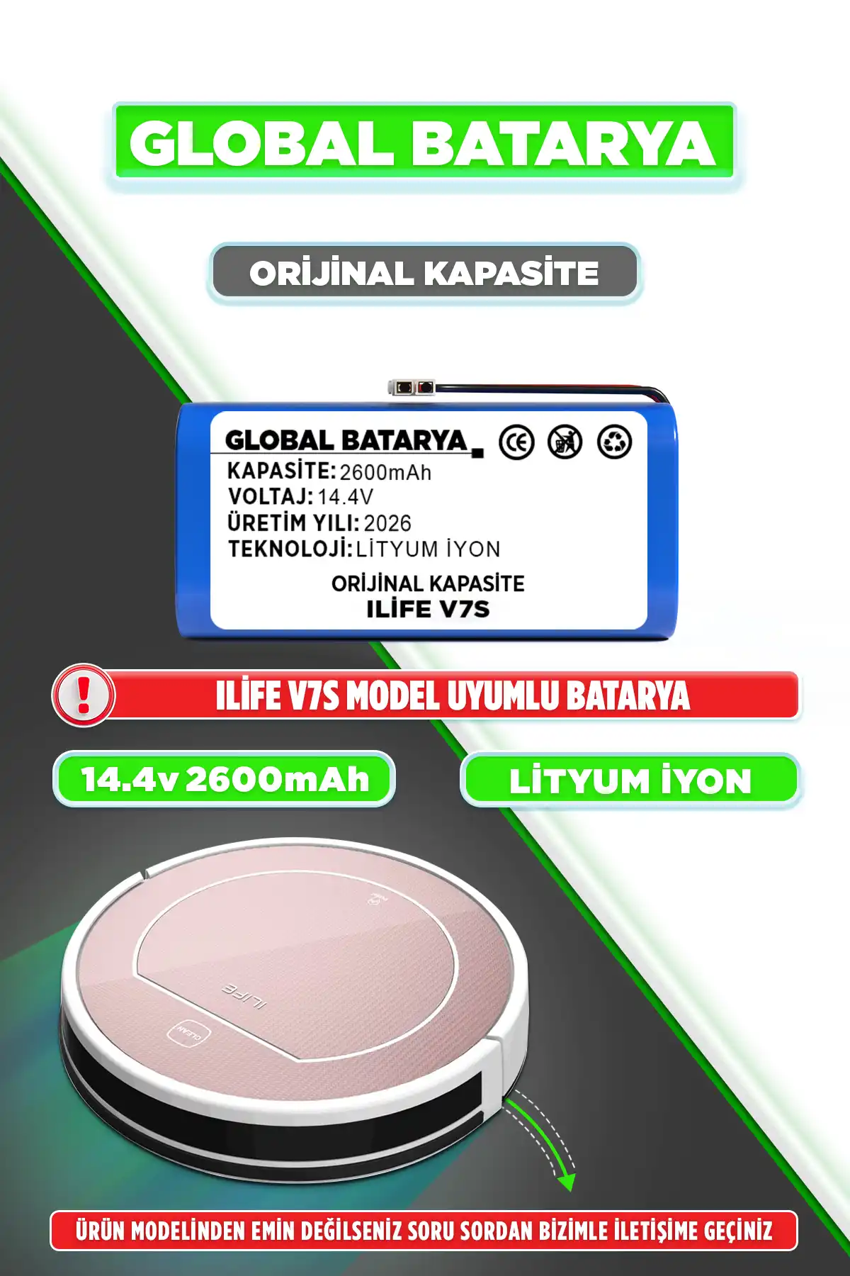 Ilıfe V7S ile uyumlu robot süpürge bataryası, gelişmiş lityum-iyon teknolojisiyle üretilmiştir. Dayanıklı ve uzun ömürlüdür. Tüm ürünler, firma tarafından test edilerek satışa sunulmaktadır. Bataryalarımız 6 ay garanti kapsamındadır ve garanti, satıcı firma tarafından sağlanmaktadır.